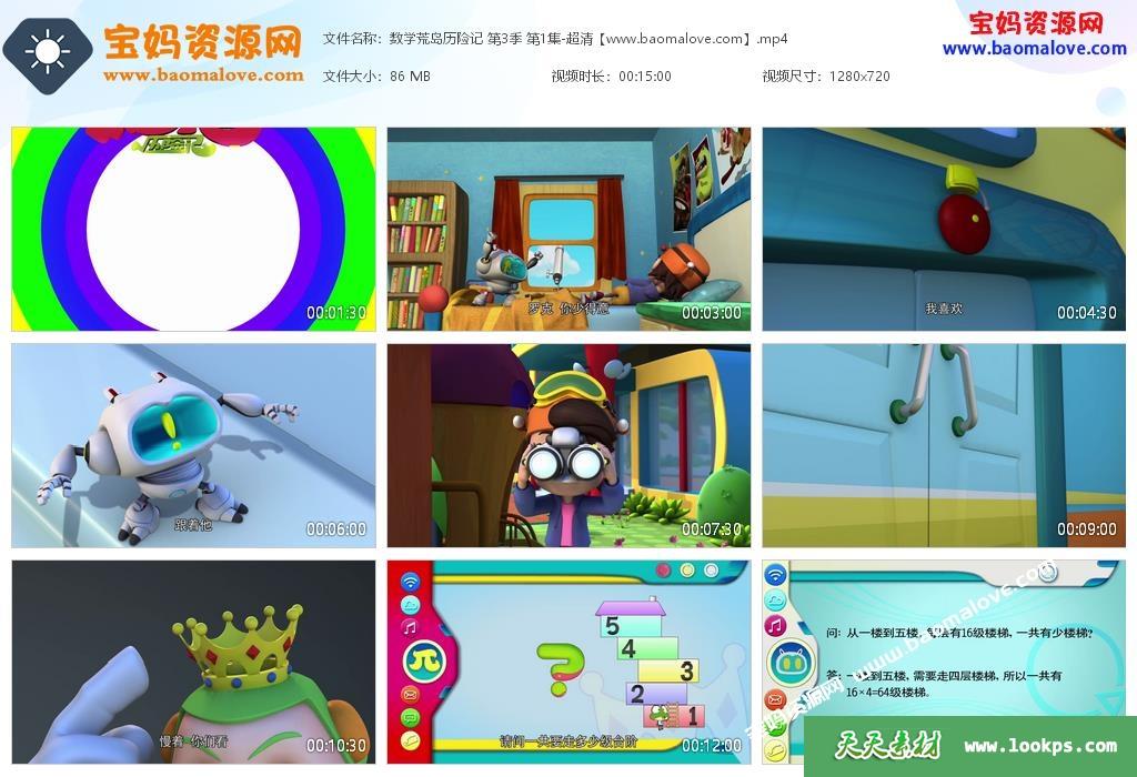 本资源是儿童数学益智动画片《数学荒岛历险记》第三季的视频下载,动画共40集,每集播放时长15分钟,资源总大小4.64G,mp4高清720p分辨率,国语发音、中文字幕,百度云网盘下载,适合5-10岁的小朋友观看。