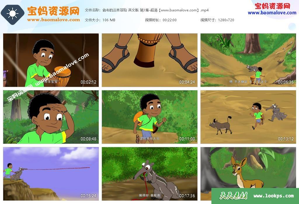 本站收录《Jabo’s Jungle》詹布的丛林冒险英文版全部39集的视频下载,英文版配有中文字幕,词汇简单、语速较慢,适合作为宝宝大英语启蒙动画;每集大小约120M,总大小4.49G,单集播放时长约22分钟,720P高清MP4格式,方便在电视机或电脑、平板、IPAD、手机等各种设备播放!