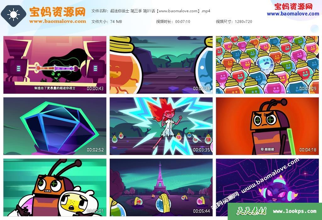 天天资源网收录的《超迷你战士》第三季全部52集视频下载,国语发音内置中文字幕;每集大小约50M,总大小2.78G,单集播放时长约7分钟,720P高清MP4格式,可以在电视机或电脑、平板、IPAD、手机等各种设备播放,提供百度云网盘下载。