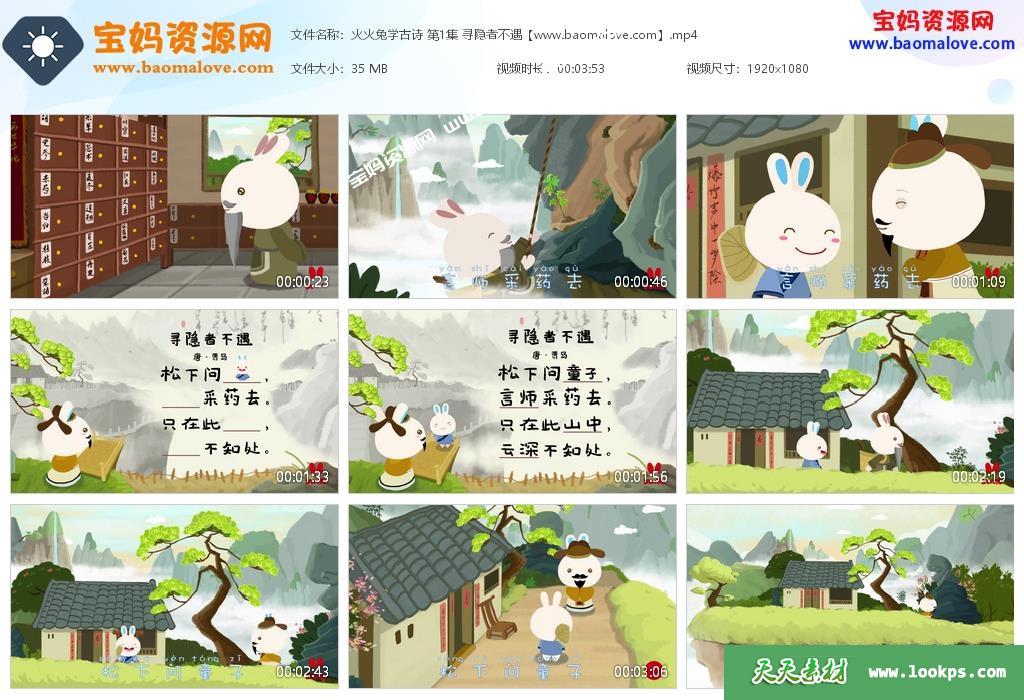 独家发布1080P高清画质,《火火兔学古诗》 全部80集,国语发音,中文字幕,每集大小约35M,总大小3.22G,播放时长约4分钟,1080P高清MP4格式,可以下载后使用电视机或电脑、平板、IPAD、手机等移动设备播放,提供百度云网盘下载!