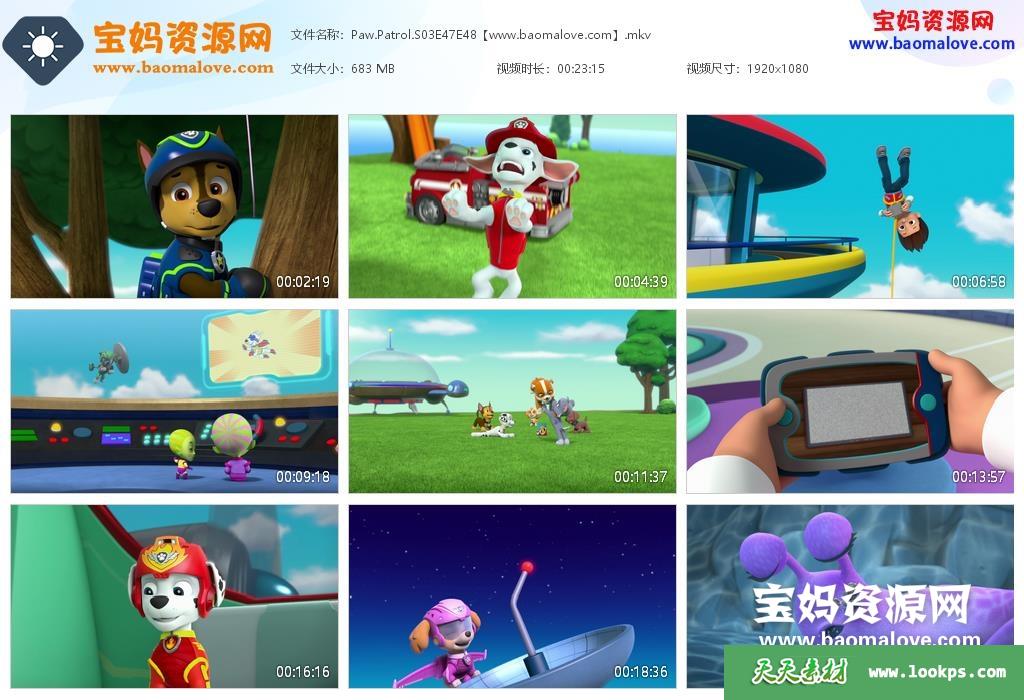 天天资源网收录的《PAW Patrol》汪汪队立大功英文版 第三季 全集48集,英语发音,内置英文字幕(可关闭,字幕的字体大小颜色也可以自己设置);每个视频大小约620M,资源总大小17.2G,单集播放时长约12分钟,1080P高清MKV格式,可以在电视机或电脑、平板、IPAD、早教机、手机等各种设备播放,提供百度云网盘下载。