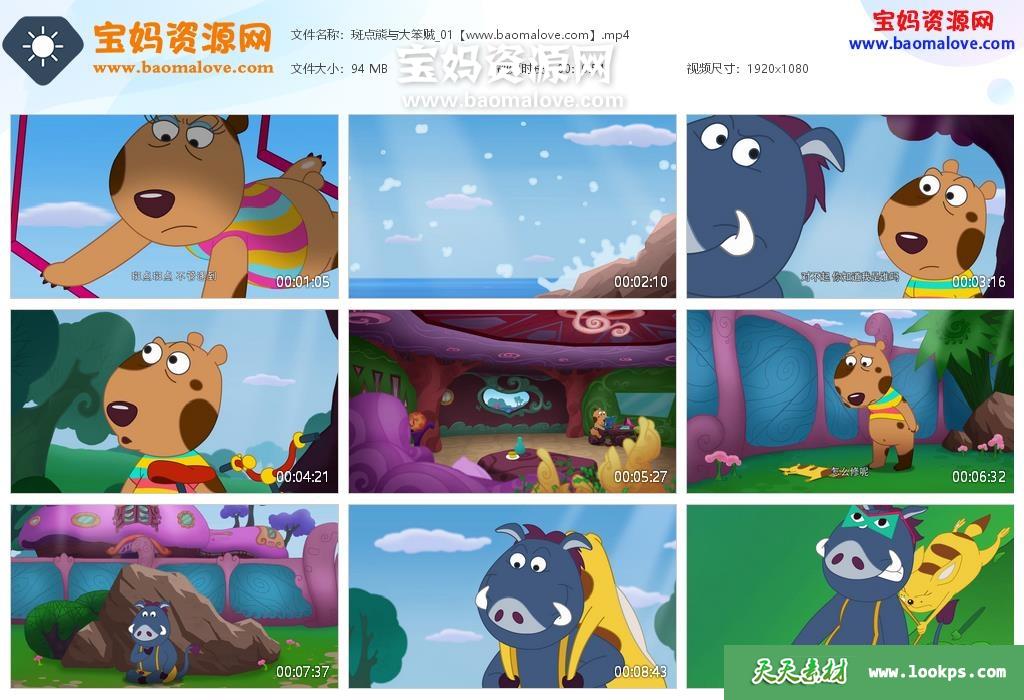 妈资源网收录的动画片《斑点熊与大笨贼》 Spots Bear中文版全部26集,国语发音,中文字幕;每集大小约100M,总大小2.64G,单集播放时长约11分钟,1080P高清MP4格式,可以在电视机或电脑、平板、IPAD、早教机、手机等各种设备播放,提供百度云网盘下载。