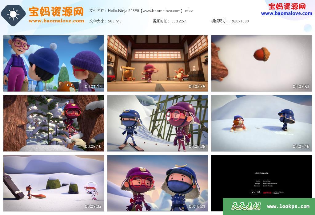 天天资源网收录的动画片《Hello Ninja》哈啰忍者英文版 第三季 全集9集,英语发音,内置英文字幕(内置多国语言字幕,如中文,法文,泰文,俄文,韩文,荷兰文,西班牙文,意大利文,德文等多国语言字幕…可以下载后使用播放器选择字幕或者关闭字幕);每集大小600M,总大小5.74G,单集播放时长约13分钟,1080P高清MKV格式,可以在电视机或电脑、平板、IPAD、早教机、手机等各种设备播放,提供百度云网盘下载。