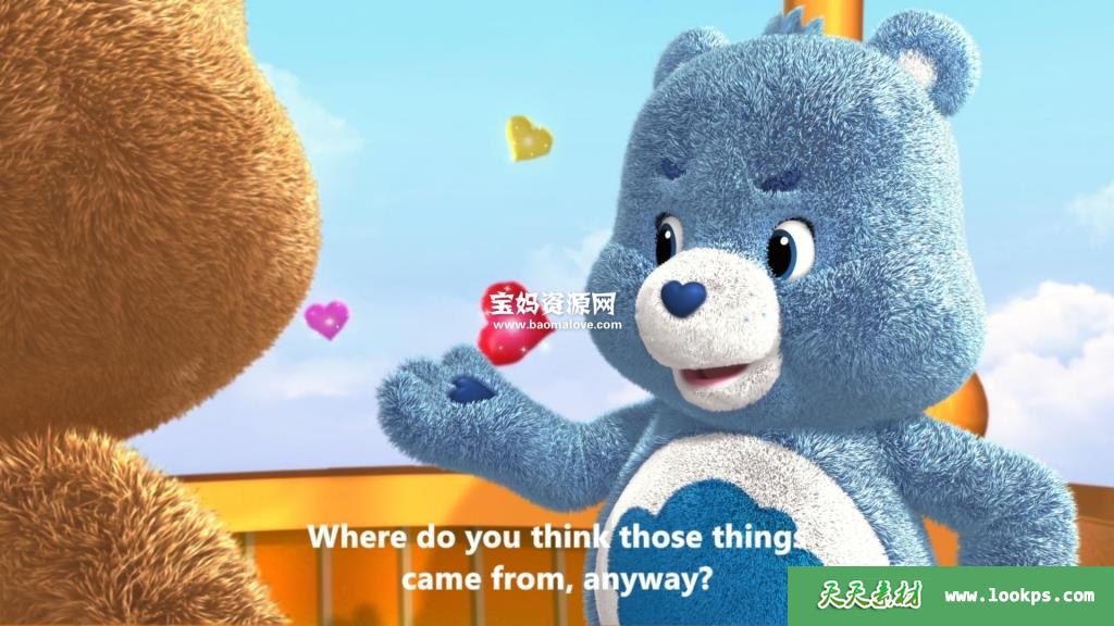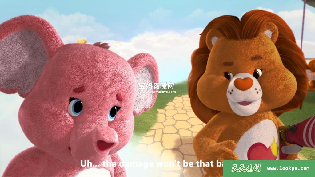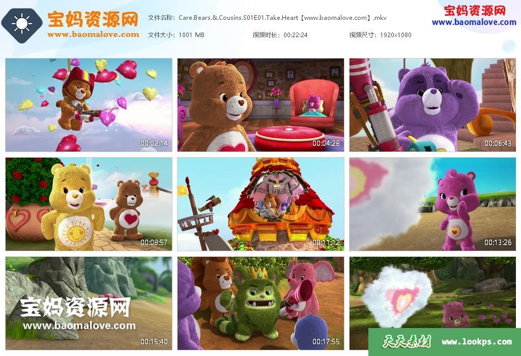 天天资源网收录的动画片《Care Bears & Cousins》爱心小熊与表亲们英文版第一二季 ,第一季6集,第二季6集,全集12集。英语发音,内置英文字幕(内置多国语言字幕,如德文,法文,葡萄牙文,西班牙文等多国语言字幕…可以下载后使用播放器选择字幕或者关闭字幕);每集大小1G,总大小13.18G,单集播放时长约23分钟,1080P高清MKV格式,可以在电视机或电脑、平板、IPAD、早教机、手机等各种设备播放,提供百度云网盘下载。