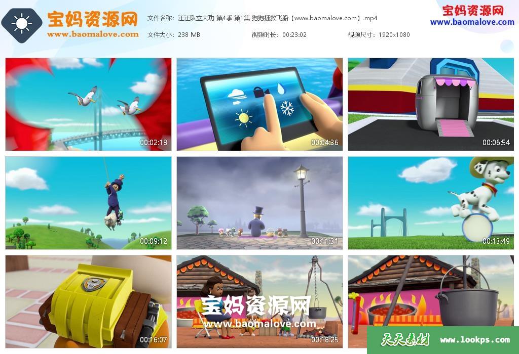 天天资源网收录的动画片《汪汪队立大功》PAW Patrol中文版 第四季 全部26集,国语发音,无字幕;每集大小约220M,总大小5.82G,单集播放时长约23分钟,1080P高清MP4格式,可以在电视机或电脑、平板、IPAD、早教机、手机等各种设备播放,提供百度网盘下载。