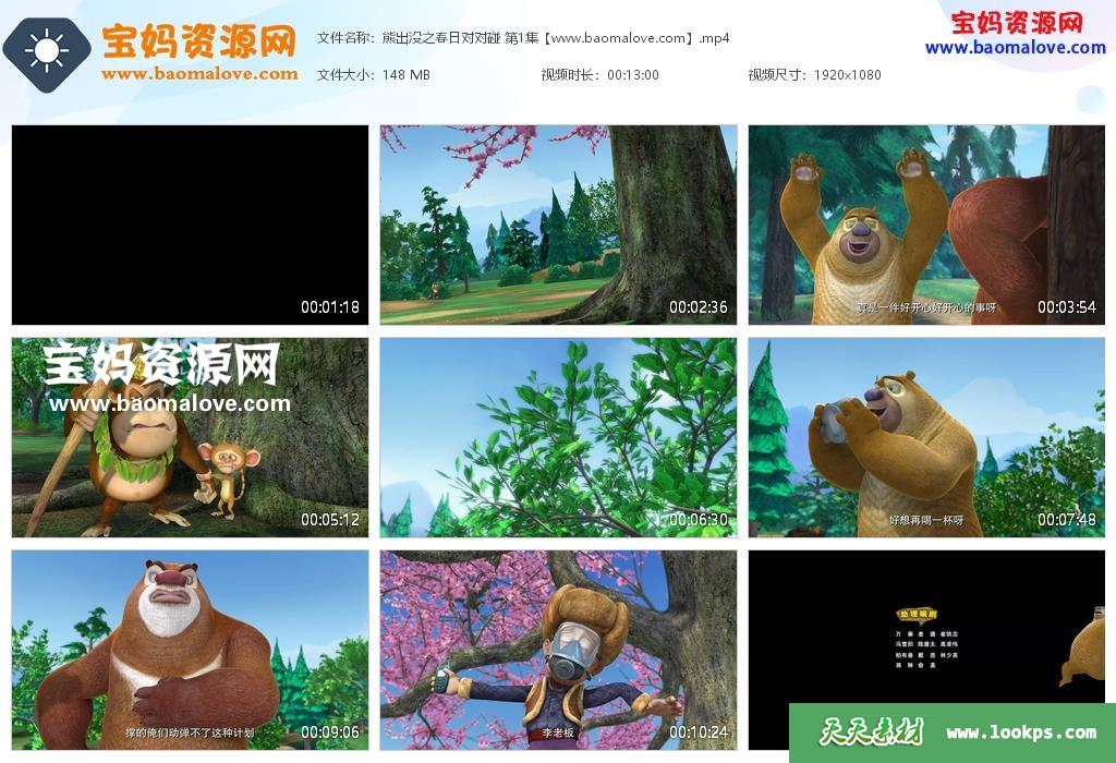 天天资源网收录的动画片《熊出没之春日对对碰》全部52集,国语发音,中文字幕;H265编码,每集大小约140M,总大小6.96G,单集播放时长约13分钟,1080P高清MP4格式,可以在电视机或电脑、平板、IPAD、早教机、手机等各种设备播放,提供百度云网盘下载。