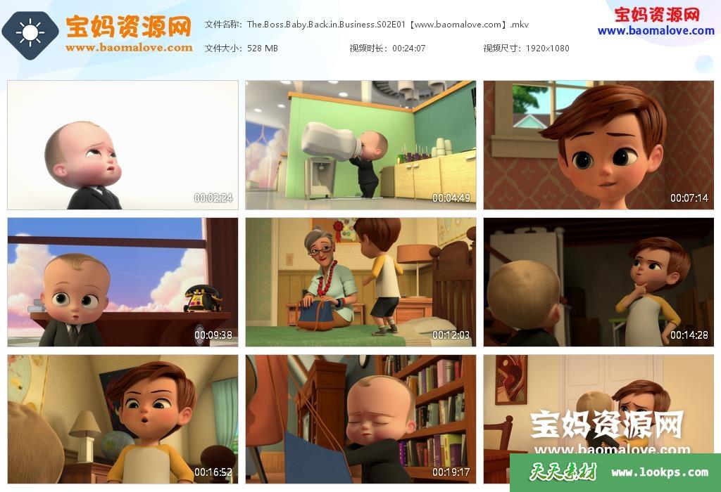 天天资源网收录的动画片《The Boss Baby: Back in Business》宝贝当家: 宝宝归来 第二季 全集13集,英语发音,内置英文字幕(内置多国语言字幕,如瑞典文,德文,挪威文,芬兰文等多国语言字幕…可以下载后使用播放器选择字幕或者关闭字幕);每集大小约520M,总大小8.54G,单集播放时长约24分钟,1080P高清MKV格式,可以在电视机或电脑、平板、IPAD、早教机、手机等各种设备播放,提供百度网盘下载。