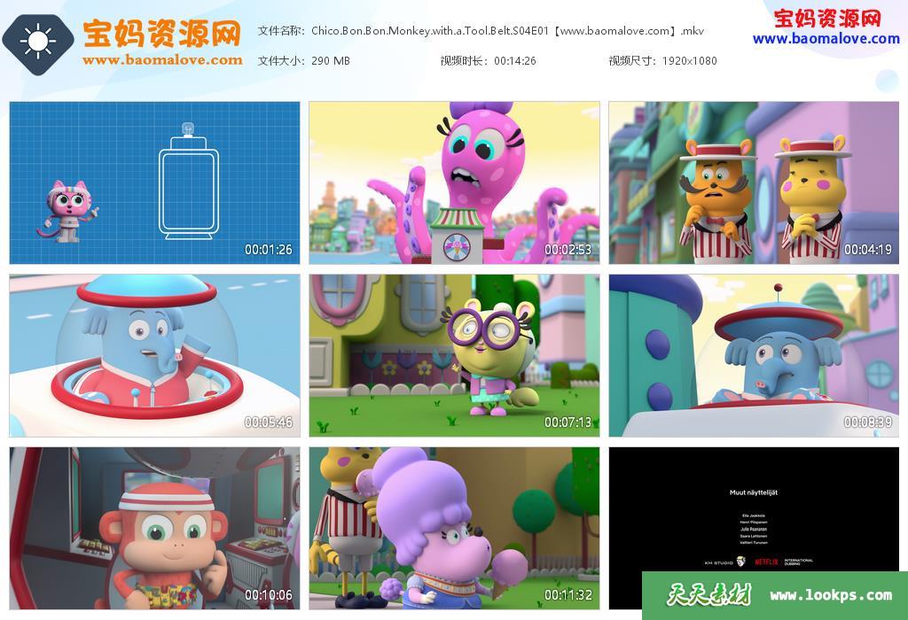 天天资源网收录的动画片《Chico Bon Bon: Monkey with a Tool Belt》奇哥·蹦蹦和他的工具箱英文版 第四季 全集8集,英语发音,内置英文字幕(内置多国语言字幕,如中文,法文,越南文,泰文,俄文,韩文,日文,西班牙文等多国语言字幕…可以下载后使用播放器选择字幕或者关闭字幕);每集大小300M,总大小2.63G,单集播放时长约14分钟,1080P高清MKV格式,可以在电视机或电脑、平板、IPAD、早教机、手机等各种设备播放,提供百度云网盘下载。