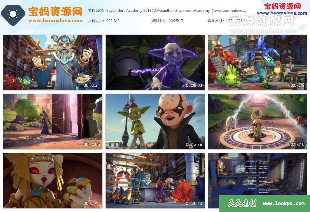 天天资源网收录的动画片《Skylanders Academy》天空城宝贝龙学院英文版 第一季 全集12集,英语发音,内置英文字幕(内置多国语言字幕,如中文,法文,德文,西班牙文,葡萄牙文等多国字幕…可以下载后使用播放器选择字幕或者关闭字幕);每集大小约990M,资源总大小11.8G,单集播放时长约25分钟,1080P高清MKV格式,可以在电视机或电脑、平板、IPAD、早教机、手机等各种设备播放,提供百度网盘下载。
