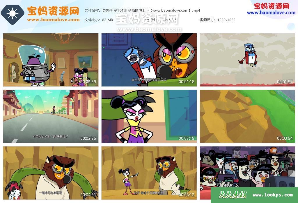 天天资源网收录的动画片《功夫鸡》Kung Fu chicken中文版 全部104集,国语发音,中文字幕;H264编码,每集大小约70M,总大小7.73G,单集播放时长约11分钟,1080P高清MP4格式,可以在电视机或电脑、平板、IPAD、早教机、手机等各种设备播放,提供百度云网盘下载。