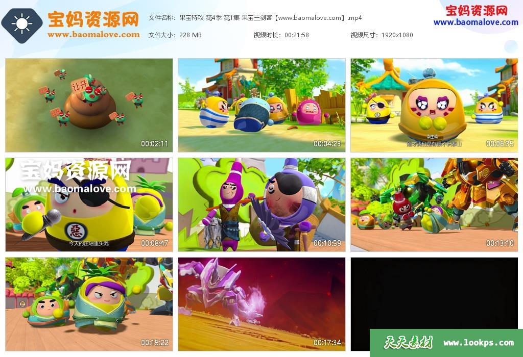 天天资源网收录的动画片《果宝特攻》Fruity Robo中文版第四季 全部52集,国语发音,中文字幕;H265编码,每集大小约200M,总大小10G,单集播放时长约22分钟,1080P高清MP4格式,可以在电视机或电脑、平板、IPAD、早教机、手机等各种设备播放,提供百度云网盘下载。