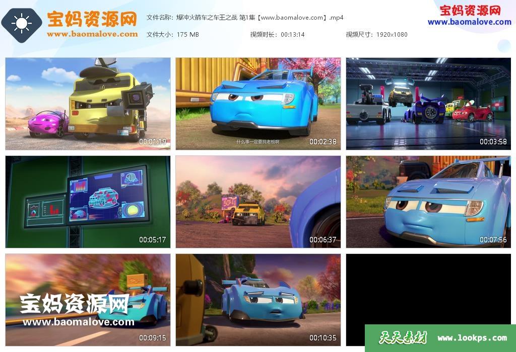 天天资源网收录的动画片《爆冲火箭车之车王之战》全部26集,国语发音,中文字幕;每集大小约180M,总大小4.93G,单集播放时长约13分钟,1080P高清MP4格式,可以在电视机或电脑、平板、IPAD、早教机、手机等各种设备播放,提供百度云网盘下载。