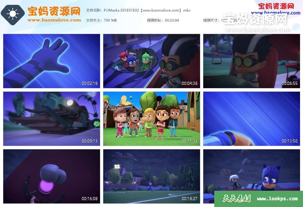 天天资源网收录的动画片《PJ Masks》睡衣小英雄英文版 第一季 全部52集,英语发音,内置英文字幕(内置多国语言字幕,如西班牙文,法文,德文,意大利文,可以下载后使用播放器设置字幕字体大小颜色或者切换关闭字幕);每集大小约380M,资源总大小18.9G,单集播放时长约12分钟,1080P高清MKV格式,可以在电视机或电脑、平板、IPAD、早教机、手机等各种设备播放,提供百度网盘下载。