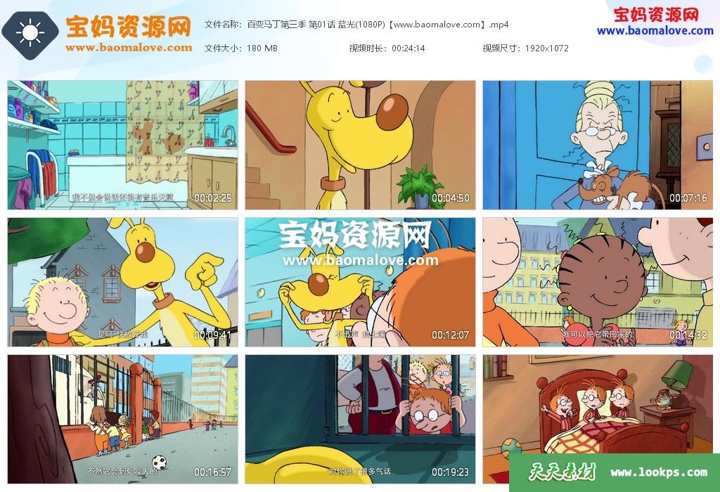 天天资源网收录的动画片《百变马丁》Martin Morning中文版 第三季全部26集,国语发音,中文字幕;每集大小约180M,总大小4.55G,单集播放时长约24分钟,1080P高清MP4格式,可以在电视机或电脑、平板、IPAD、早教机、手机等各种设备播放,提供百度云网盘下载。