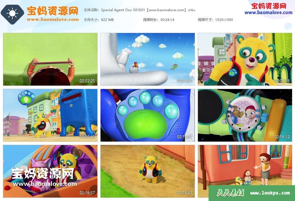 天天资源网收录的动画片《Special Agent Oso》特务欧宝英文版 第一季 全部48集,英语发音,内置英文字幕(可以下载后使用播放器设置字幕字体大小颜色或者切换关闭字幕);;每集大小约360M,资源总大小19.7G,单集播放时长约12分钟,1080P高清MKV格式,可以在电视机或电脑、平板、IPAD、早教机、手机等各种设备播放,提供百度网盘下载。