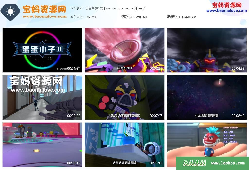 天天资源网收录的动画片《蛋星侠》 全部52集,国语发音,中文字幕;每集大小约190M,总大小10.2G,单集播放时长约15分钟,1080P高清MP4格式,可以在电视机或电脑、平板、IPAD、早教机、手机等各种设备播放,提供百度云网盘下载。