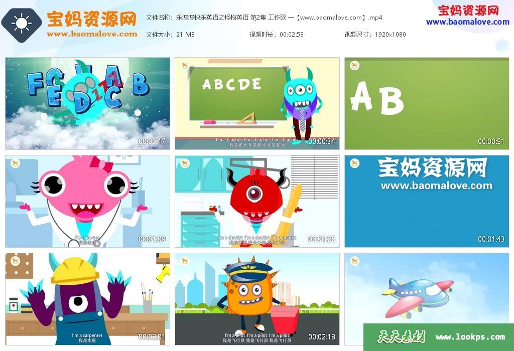 天天资源网收录的动画片《乐悠悠快乐英语之怪物英语》 全部59集,英语发音,内置中英文字幕;每集大小约30M,总大小1.78G,单集播放时长约3分钟,1080P高清MP4格式,可以在电视机或电脑、平板、IPAD、早教机、手机等各种设备播放,提供百度云网盘下载。