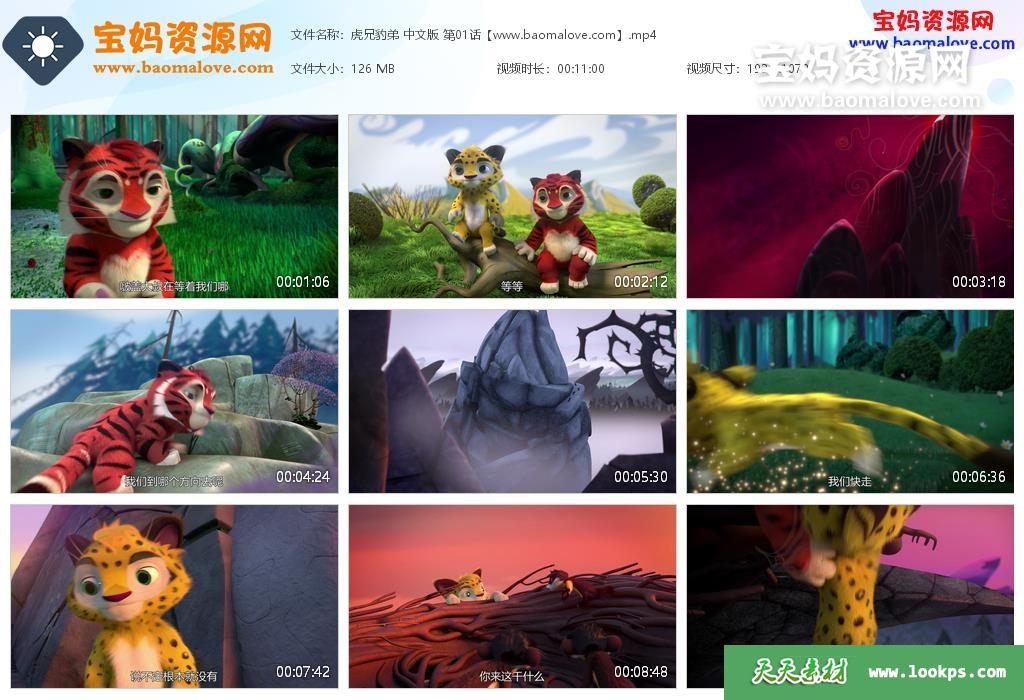 天天资源网收录的动画片《虎兄豹弟》Tig and Leo中文版,全部26集,国语发音,中文字幕;每集大小约130M,总大小3.84G,单集播放时长约11分钟,1080P高清MP4格式,可以在电视机或电脑、平板、IPAD、早教机、手机等各种设备播放,提供百度网盘下载。