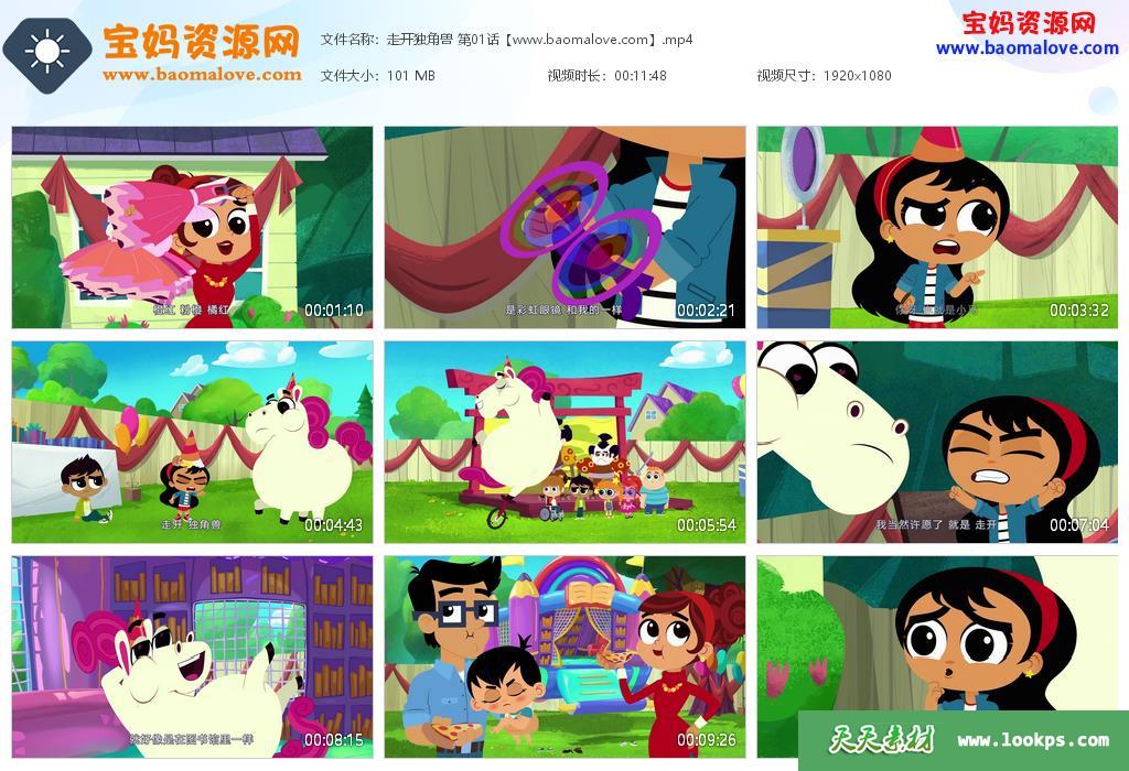 天天资源网收录的动画片《走开吧 独角兽》Go Away, Unicorn!中文版,全部52集,国语发音,中文字幕;每集大小约95M,总大小4.96G,单集播放时长约12分钟,1080P高清MP4格式,可以在电视机或电脑、平板、IPAD、早教机、手机等各种设备播放,提供百度网盘下载。