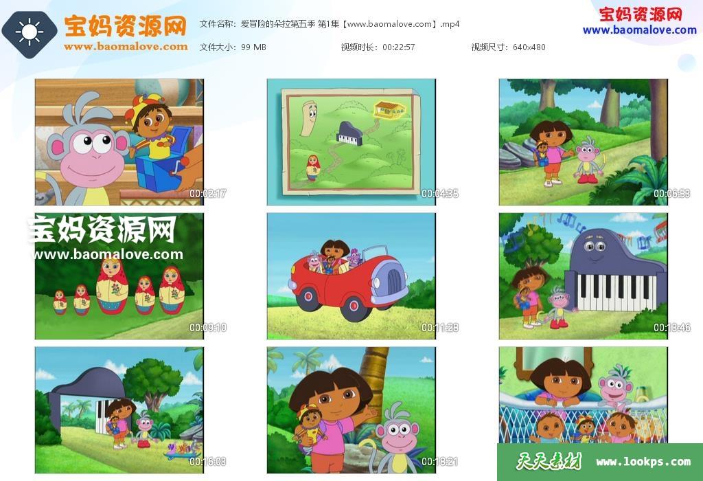 天天资源网收录的《爱探险的朵拉》Dora The Explorer中文版 第五季,全部16集,国语发音,无字幕;每集大小约100M,总大小1.54G,单集播放时长约24分钟,480P高清MP4格式,可以在电视机或电脑、平板、IPAD、手机等各种设备播放,提供百度云网盘下载!