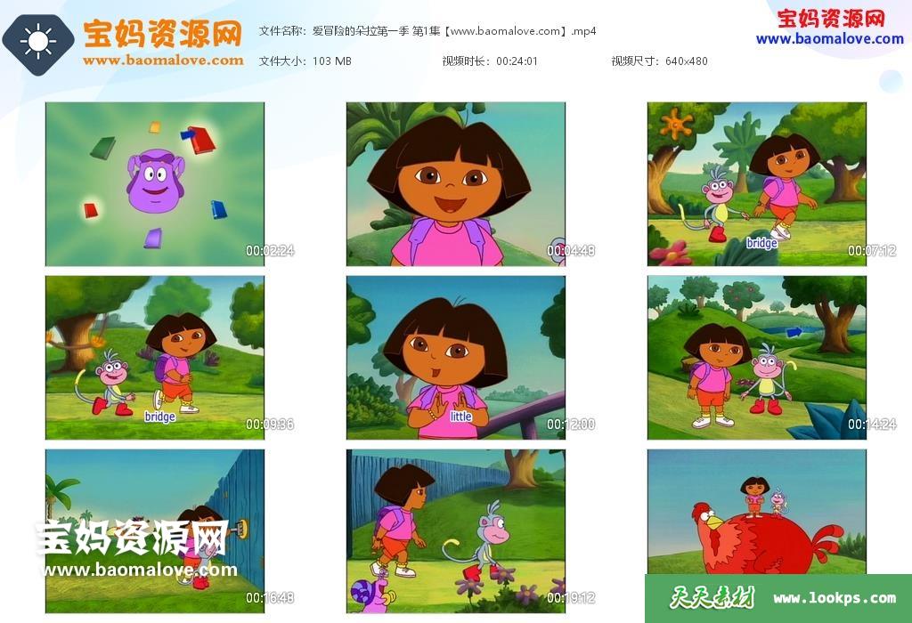 天天资源网收录的《爱探险的朵拉》Dora The Explorer中文版 第一季,国语发音,单词有字幕;每集大小约100M,总大小2.62G,单集播放时长约24分钟,480P高清MP4格式,可以在电视机或电脑、平板、IPAD、手机等各种设备播放,提供百度云网盘下载!