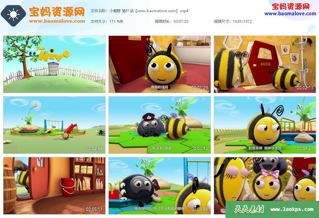 天天资源网收录的动画片《小蜜蜂》THE HIVE 中文版 第一季,全部78集,国语发音,中文字幕;每集大小约95M,总大小6.68G,单集播放时长约7分钟,1080P高清MP4格式,可以在电视机或电脑、平板、IPAD、早教机、手机等各种设备播放,提供百度网盘下载。