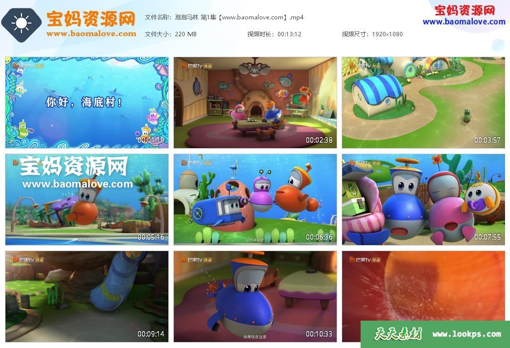 天天资源网收录的动画片《泡泡马林》Bubble Bubble Marin中文版全部52集,国语发音,中文字幕;每集大小约200M,总大小9.89G,单集播放时长约13分钟,1080P高清MP4格式,可以在电视机或电脑、平板、IPAD、早教机、手机等各种设备播放,提供百度云网盘下载。