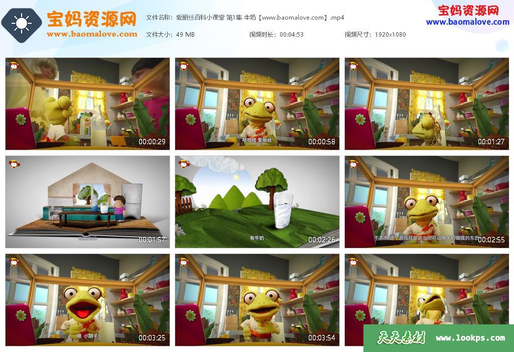 天天资源网收录的动画片《爱丽丝百科小课堂》,全部50集,国语发音,中文字幕;每集大小约55M,总大小2.95G,单集播放时长约5分钟,1080P高清MP4格式,可以在电视机或电脑、平板、IPAD、早教机、手机等各种设备播放,提供百度网盘下载。