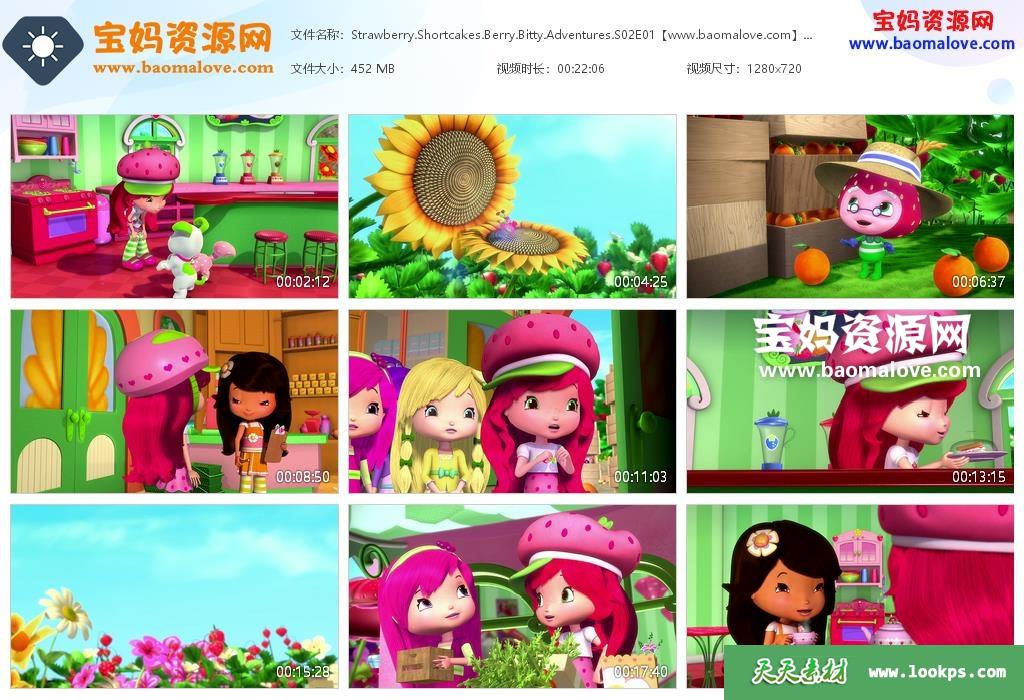 天天资源网收录的动画片《Strawberry Shortcake’s Berry Bitty Adventures》草莓甜心:草莓乐园英文版 第二季 全部13集,英语发音,内置英文字幕(可以下载后使用播放器设置字幕字体大小颜色或者切换关闭字幕);每集大小约490M,资源总大小6.4G,单集播放时长约23分钟,720P高清MKV格式,可以在电视机或电脑、平板、IPAD、早教机、手机等各种设备播放,提供百度网盘下载。