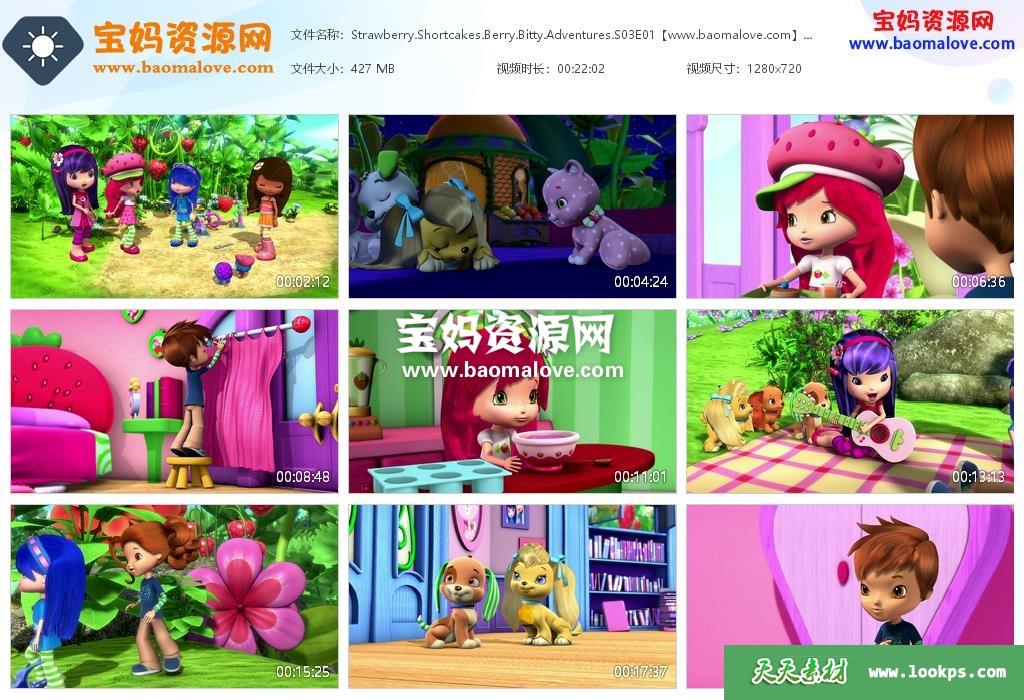 天天资源网收录的动画片《Strawberry Shortcake’s Berry Bitty Adventures》草莓甜心:草莓乐园英文版 第三季 全部13集,英语发音,内置英文字幕(可以下载后使用播放器设置字幕字体大小颜色或者切换关闭字幕);每集大小约400M,资源总大小5.38G,单集播放时长约22分钟,720P高清MKV格式,可以在电视机或电脑、平板、IPAD、早教机、手机等各种设备播放,提供百度网盘下载。