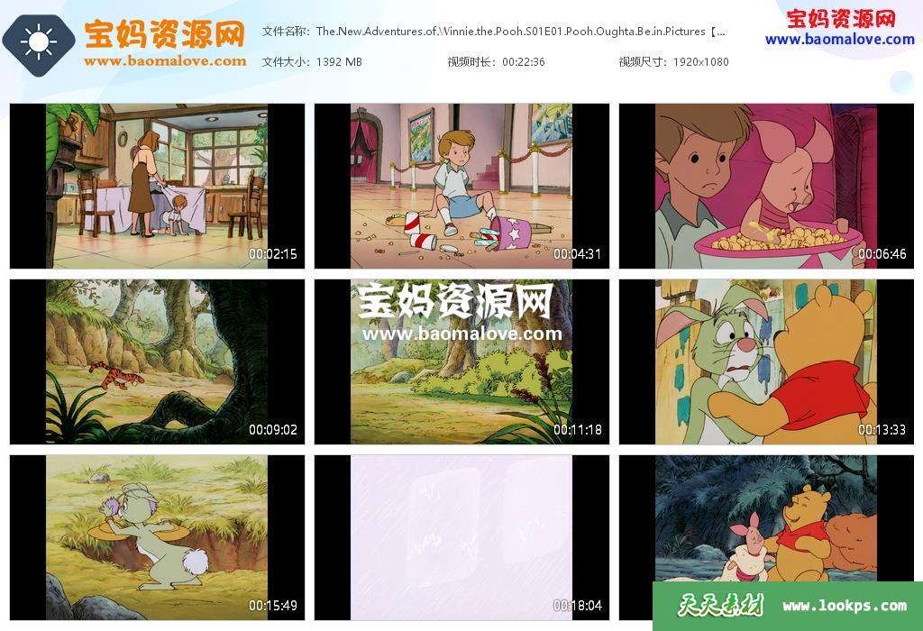 天天资源网收录的动画片《The New Adventures of Winnie the Pooh》小熊维尼历险记英文版 第一季全部26集,英语发音,内置英文字幕(可以下载后使用播放器设置字幕字体大小颜色或者切换关闭字幕);每集大小约1.36G,资源总大小35.8G,单集播放时长约23分钟,1080P高清MKV格式,可以在电视机或电脑、平板、IPAD、早教机、手机等各种设备播放,提供百度网盘下载。