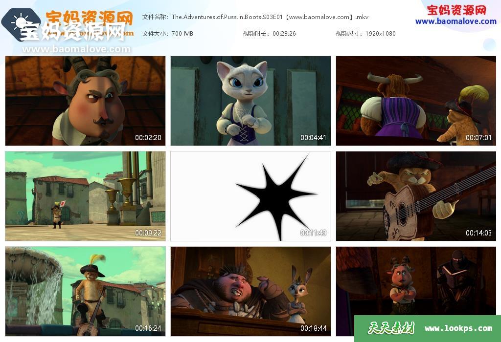 天天资源网收录的《The Adventures of Puss in Boots》穿靴子的猫历险记英文版 第三季,全集13集,英语发音,内置英文字幕(内置多国语言字幕,如德文,西班牙文,法文,葡萄牙文等等…可以下载后使用播放器选择字幕或者关闭字幕);每集大小约700M,总大小8.94G,单集播放时长约23分钟,1080P高清MKV格式,可以在电视机或电脑、平板、IPAD、早教机、手机等各种设备播放,提供百度云网盘下载。