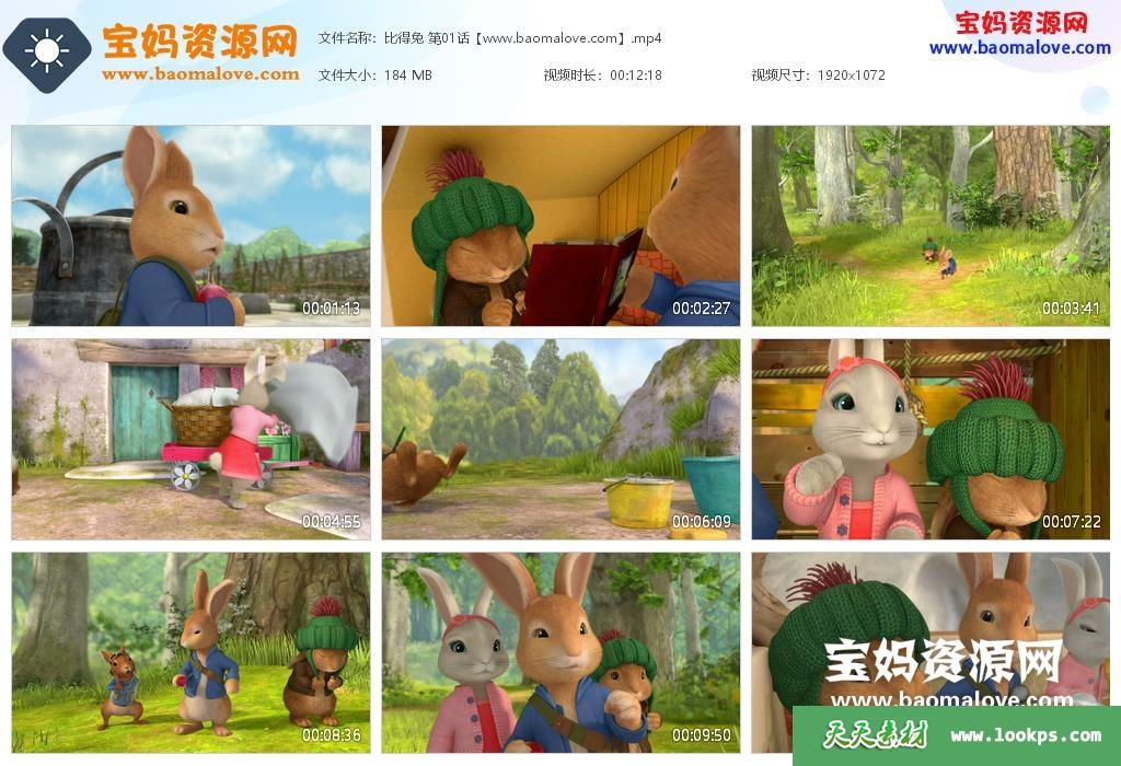 天天资源网收录的动画片《比得兔》Peter Rabbit中文版,全部107集,国语发音,中文字幕;每集大小约180M,总大小16.2G,单集播放时长约12分钟,1080P高清MP4格式,可以在电视机或电脑、平板、IPAD、早教机、手机等各种设备播放,提供百度云网盘下载。