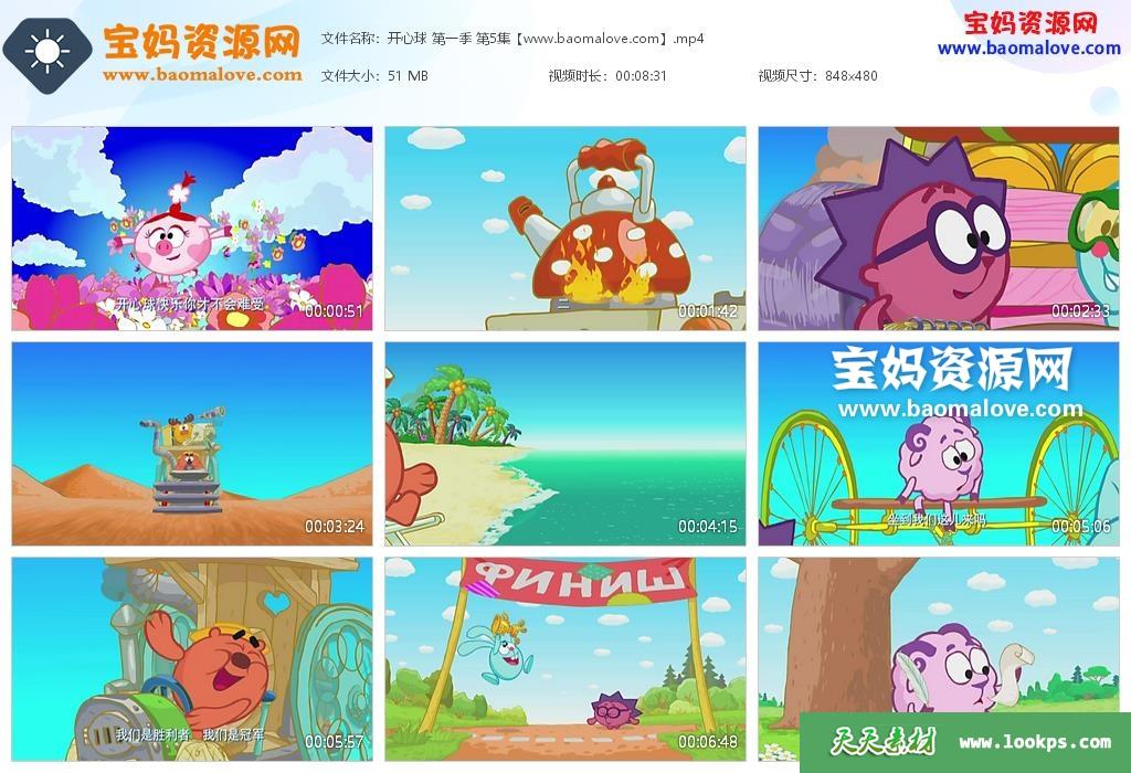 天天资源网收录的动画片《瑞奇开心球》Gogoriki, Kikoriki中文版 第1~3季 ,第一季75集,第二季59集,第三季52集,全部186集,国语发音,中文字幕;每集大小约45M,总大小9.02G,单集播放时长约9~10分钟,480P普清MP4格式(资源较老,目前480P是全网最高画质分辨率),可以在电视机或电脑、平板、IPAD、早教机、手机等各种设备播放,提供百度云网盘下载。