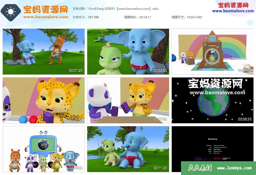 天天资源网收录的动画片《Word Party》文字派对英文版 第五季,全集10集,英语发音,内置英文字幕(内置多国语言字幕,如阿拉伯文,丹麦文,德文,希腊文,西班牙文,芬兰文,法文,意大利文,日文,韩文,挪威文,荷兰文,波兰文,葡萄牙文,泰文,罗马尼亚文,土耳其文,越南文,简体中文,繁体中文);每集大小400M,总大小4.11G,单集播放时长约14分钟,1080P高清MKV格式,可以在电视机或电脑、平板、IPAD、早教机、手机等各种设备播放,提供百度云网盘下载。