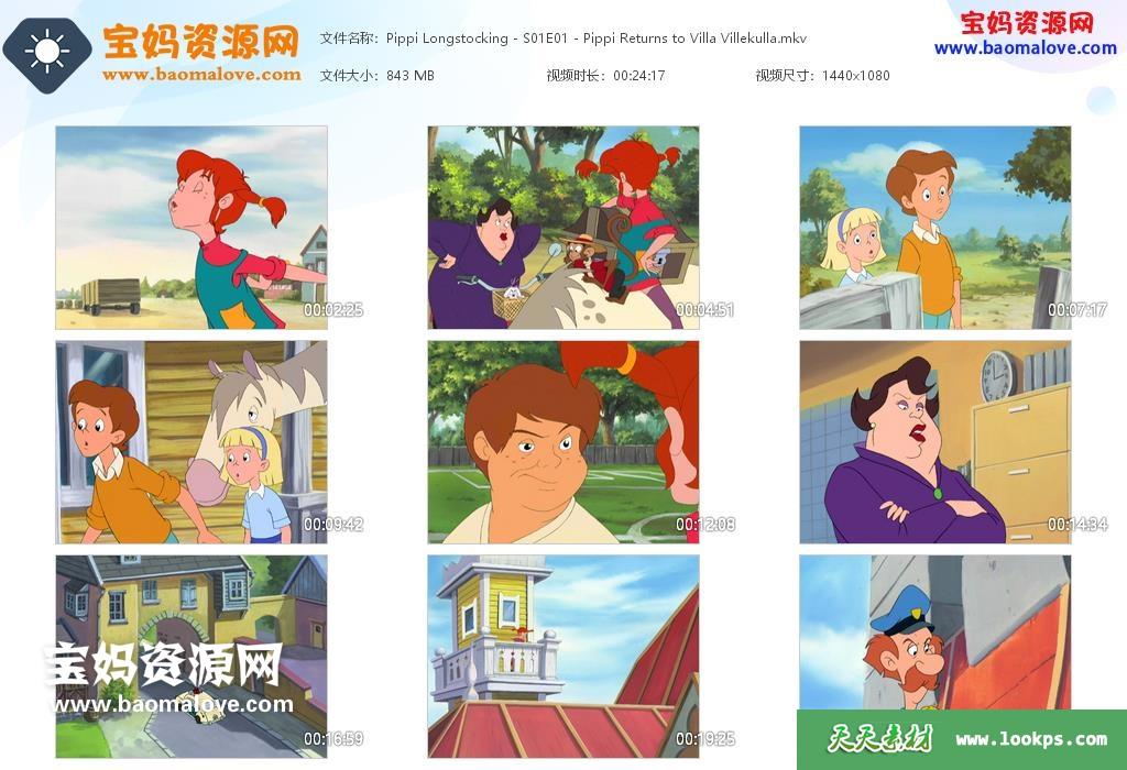 天天资源网收录的动画片《Pippi Longstocking》长袜子皮皮英文版 第一季,全集26集,英语发音,内置英文字幕(可以下载后使用播放器选择设置字幕或者关闭字幕);每集大小约820M,资源总大小20.8G,单集播放时长约24分钟,1080P高清MKV格式,可以在电视机或电脑、平板、IPAD、早教机、手机等各种设备播放,提供百度云网盘下载。