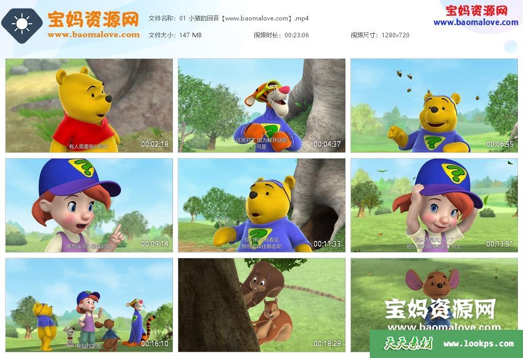 天天资源网收录的动画片《小熊维尼与跳跳虎》My Friends Tigger and Pooh中文版 第一季,全部26集,国语发音,中文字幕;每集大小约145M,总大小3.84G,单集播放时长约23分钟,720P高清MP4格式,可以在电视机或电脑、平板、IPAD、早教机、手机等各种设备播放,提供百度云网盘下载。