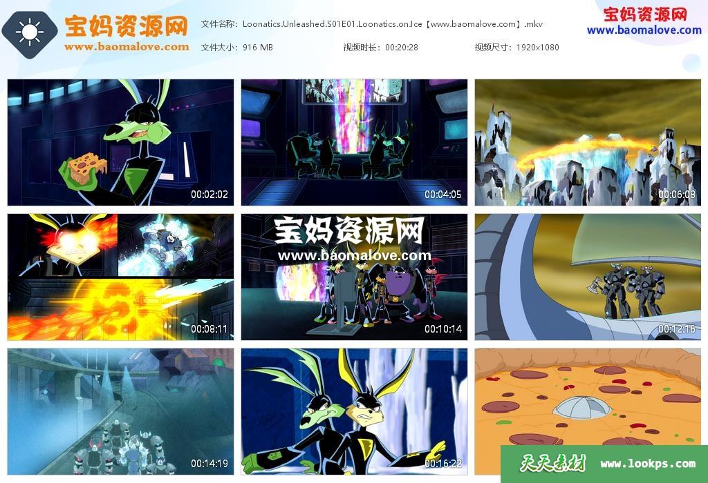 天天资源网收录的动画片《Loonatics Unleashed》超能乐一通英文版 第一季,全部13集,英语发音,内置英文字幕(可以下载后使用播放器选择设置字幕或者关闭字幕);每集大小约900M,资源总大小11.5G,单集播放时长约20分钟,1080P高清MKV格式,可以在电视机或电脑、平板、IPAD、早教机、手机等各种设备播放,提供百度云网盘下载。