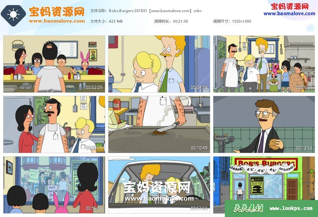 天天资源网收录的动画片《Bob’s Burgers》 开心汉堡店英文版 第一季,全部13集,英语发音,内置英文字幕(可以下载后使用播放器选择设置字幕或者关闭字幕);每集大小约430M,资源总大小5.82G,单集播放时长约22分钟,1080P高清MKV格式,可以在电视机或电脑、平板、IPAD、早教机、手机等各种设备播放,提供百度云网盘下载。