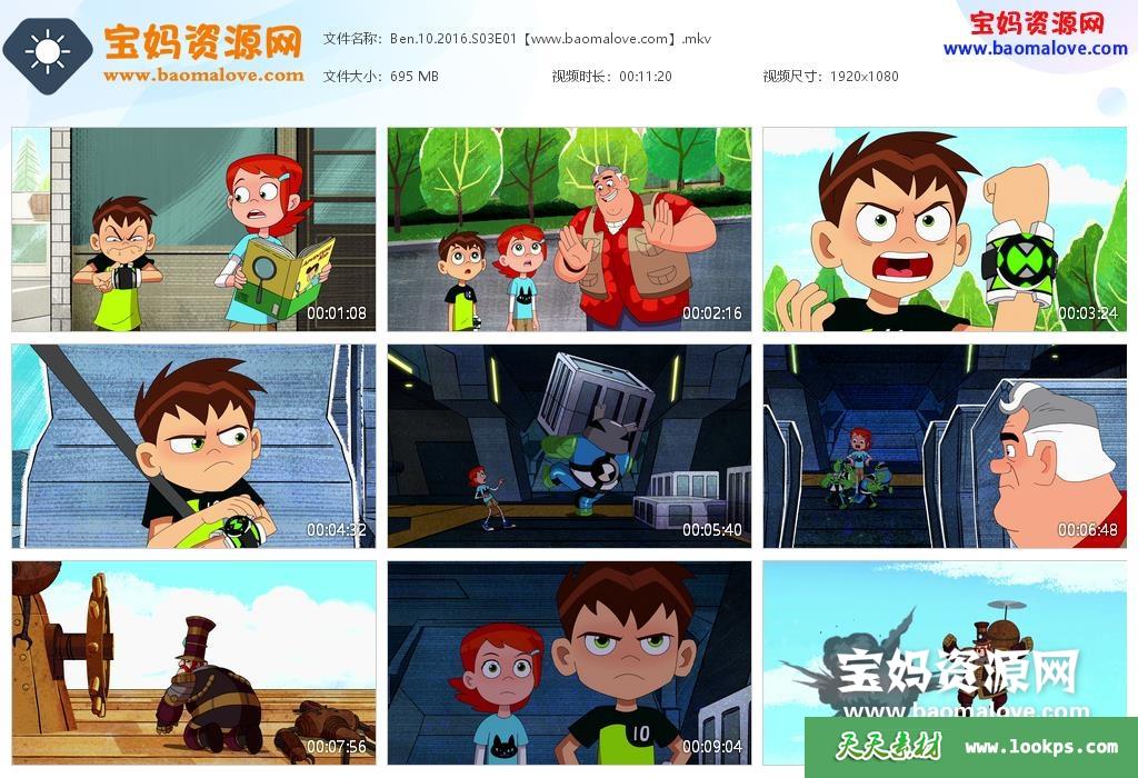 天天资源网收录的动画片《Ben 10》少年骇客英文版 第三季,全部52集,英语发音,内置英文字幕(可以下载后使用播放器选择设置字幕或者关闭字幕);每集大小约670M,资源总大小26.8G,单集播放时长约11分钟,1080P高清MKV格式,可以在电视机或电脑、平板、IPAD、早教机、手机等各种设备播放,提供百度云网盘下载。