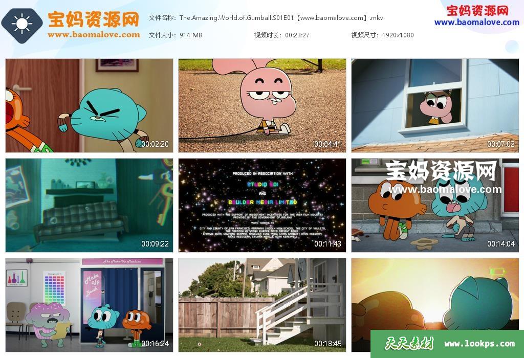 天天资源网收录的动画片《The Amazing World of Gumball》阿甘妙世界英文版 第一季,全部36集,英语发音,内置英文字幕(可以下载后使用播放器选择设置字幕或者关闭字幕);每集大小约430M,资源总大小15.9G,单集播放时长约11分钟,1080P高清MKV格式,可以在电视机或电脑、平板、IPAD、早教机、手机等各种设备播放,提供百度云网盘下载。