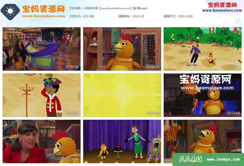 天天资源网收录的《小鸡奇卡秀》The Chica Show中文版 第一季,全部13集,国语发音,无字幕;每集大小约400M,总大小5.20G,单集播放时长约21分钟,1080P高清MP4格式,可以在电视机或电脑、平板、IPAD、早教机、手机等各种设备播放,提供百度云网盘下载。