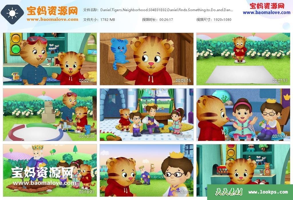 天天资源网收录的动画片《Daniel Tiger’s Neighborhood》小老虎丹尼尔英文版 第四季,全部34集,英语发音,内置英文字幕(可以下载后使用播放器选择设置字幕或者关闭字幕);每集大小约700M,资源总大小25.3G,单集播放时长约13分钟,1080P高清MKV格式,可以在电视机或电脑、平板、IPAD、早教机、手机等各种设备播放,提供百度云网盘下载。
