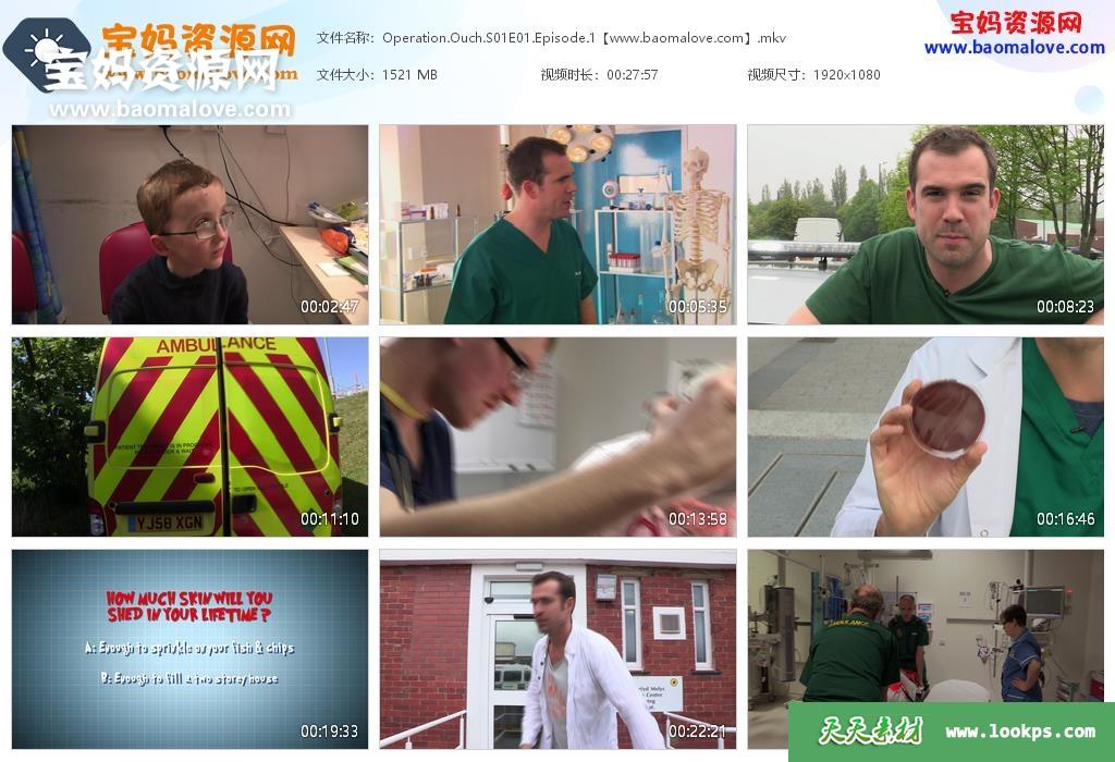 天天资源网收录的动画片《Operation Ouch!》 第一季,全部13集,英语发音,内置英文字幕(可以下载后使用播放器选择设置字幕或者关闭字幕);每集大小约1450M,资源总大小18.9G,单集播放时长约28分钟,1080P高清MKV格式,可以在电视机或电脑、平板、IPAD、早教机、手机等各种设备播放,提供百度云网盘下载。