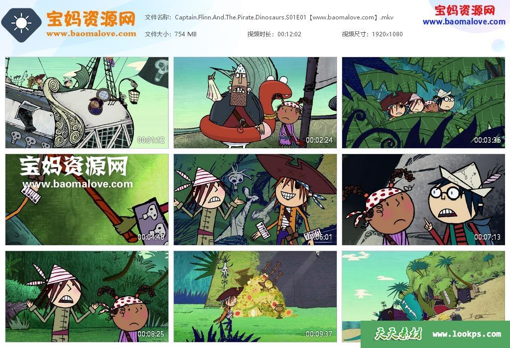 天天资源网收录的动画片《Captain Flinn and the Pirate Dinosaurs》福林船长与恐龙海盗英文版 第一季,全部52集,英语发音,无字幕;每集大小约700M,资源总大小37.3G,单集播放时长约12分钟,1080P高清MKV格式,可以在电视机或电脑、平板、IPAD、早教机、手机等各种设备播放,提供百度云网盘下载。