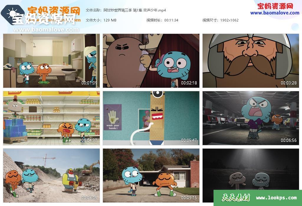 天天资源网收录的动画片《阿甘妙世界》The Amazing World of Gumball中文版 第三季,全部40集,国语发音,无字幕;每集大小约130M,总大小5.16G,单集播放时长约11分钟,1080P高清MP4格式,可以在电视机或电脑、平板、IPAD、早教机、手机等各种设备播放,提供百度云网盘下载。