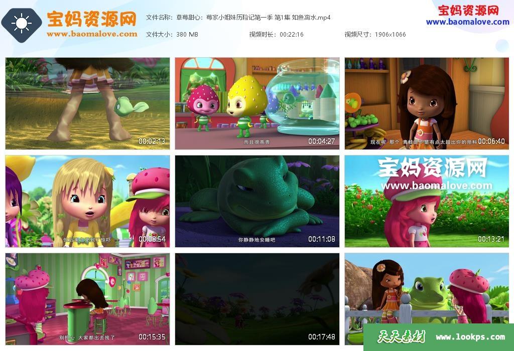 天天资源网收录的动画片《草莓甜心:莓家小姐妹历险记》Strawberry Shortcake’s Berry Bitty Adventures中文版 第一季,全部26集,国语发音,中文字幕;每集大小约320M,总大小8.31G,单集播放时长约22分钟,1080P高清MP4格式,可以在电视机或电脑、平板、IPAD、早教机、手机等各种设备播放,提供百度云网盘下载。