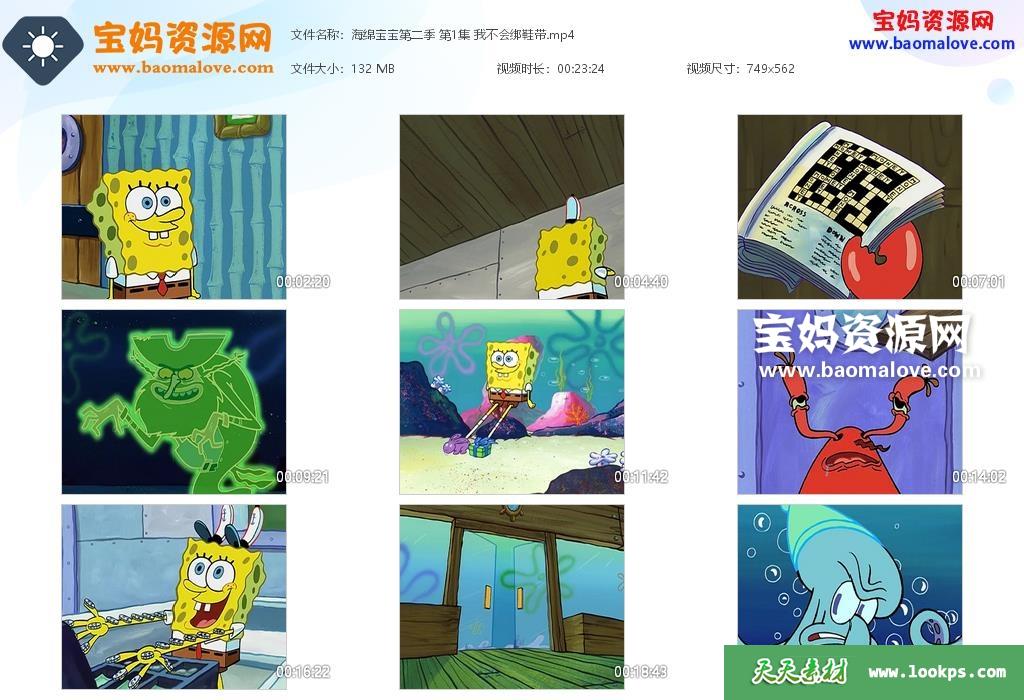 天天资源网收录的《海绵宝宝》SpongeBob SquarePants中文版 第二季,全部20集,国语发音,无字幕;每集大小约130M,总大小2.57G,单集播放时长约23分钟,562P标清MP4格式,可以在电视机或电脑、平板、IPAD、早教机、手机等各种设备播放,提供百度云网盘下载。