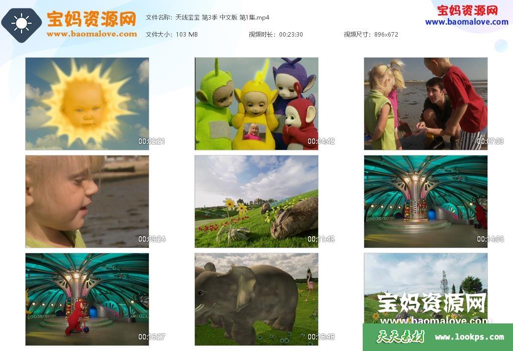 天天资源网收录的《天线宝宝》Teletubbies中文版 第三季,全部26集,国语发音,无字幕;每集大小约115M,总大小3.09G,单集播放时长约24分钟,672P标清MP4格式,可以在电视机或电脑、平板、IPAD、早教机、手机等各种设备播放,提供百度云网盘下载。