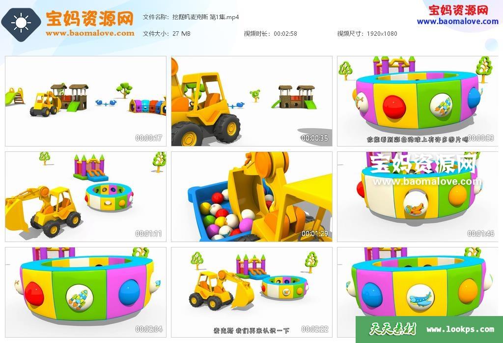 天天资源网收录的动画片《挖掘机麦克斯》Excavator Max中文版,全部43集,国语发音,中文字幕;每集大小约25M,资源总大小1.96G,单集播放时长约3分钟,1080P高清MP4格式,可以在电视机或电脑、平板、IPAD、早教机、手机等各种设备播放,提供百度云网盘下载。